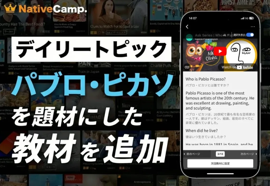オンライン英会話サービス「ネイティブキャンプ英会話」が、人気教材「デイリートピック」にパブロ・ピカソをテーマにした新しい教材を追加しました。アートと英語を組み合わせたこの教材は、子どもたちの知的好奇心を刺激し、英語で自分の考えを表現する力を育むのに役立ちます。