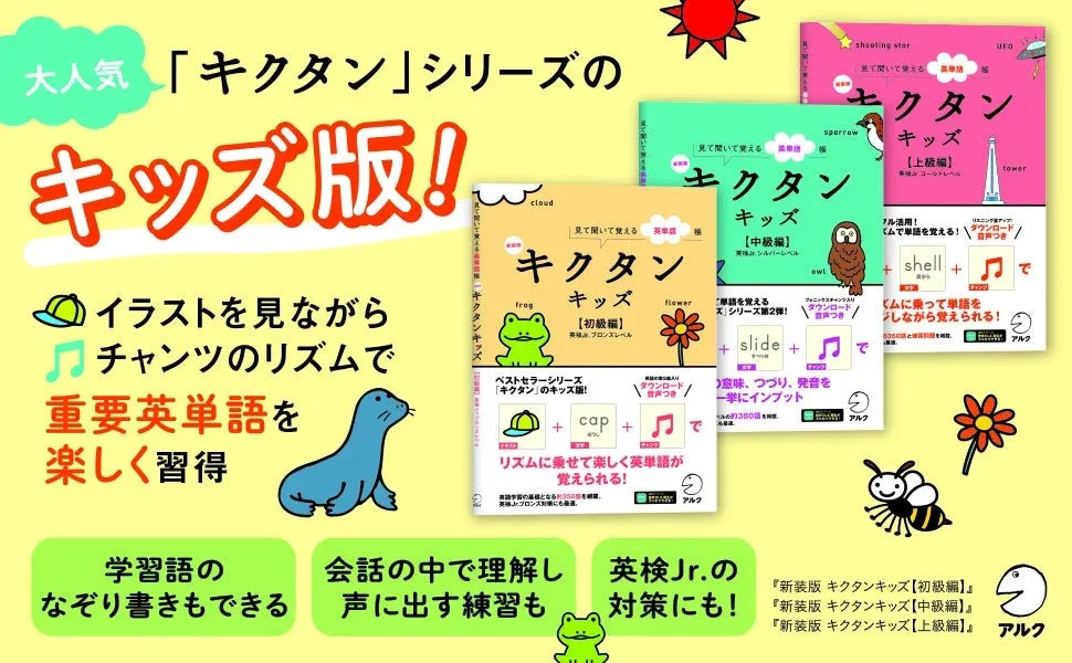 ベストセラー「キクタン」シリーズのキッズ向けバージョンが、この度『新装版 キクタンキッズ』として生まれ変わりました。お子さんが楽しく英語の語彙を身につけられるよう、「見て聞いて覚える」多感覚学習を取り入れ、初級から上級まで3レベルが用意されています。英検Jr.の対策にも対応しており、家庭での英語学習を強力にサポートします。 -