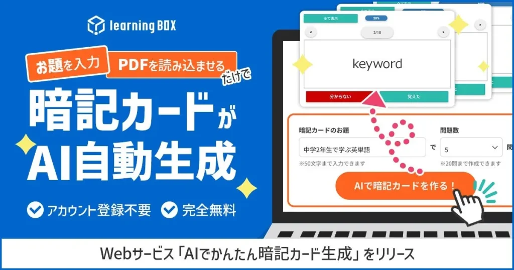 お子さんの家庭学習に役立つ新しいWebサービス「AIでかんたん暗記カード生成」をご紹介します。AIがお題やPDFから自動で暗記カードを作ってくれるので、手軽に楽しく復習を進められます。 -