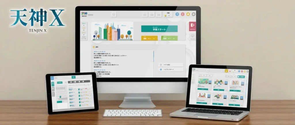 クラウド型ICT教材「天神X」が、海外からの学習にも対応するタイムゾーン機能と、学習履歴を簡単に共有できる報告DX機能を新たに搭載しました。保護者の皆さんの日々の学習管理の負担を減らし、子どもたちがより集中して学べる環境を整えるためのアップデートです。 -