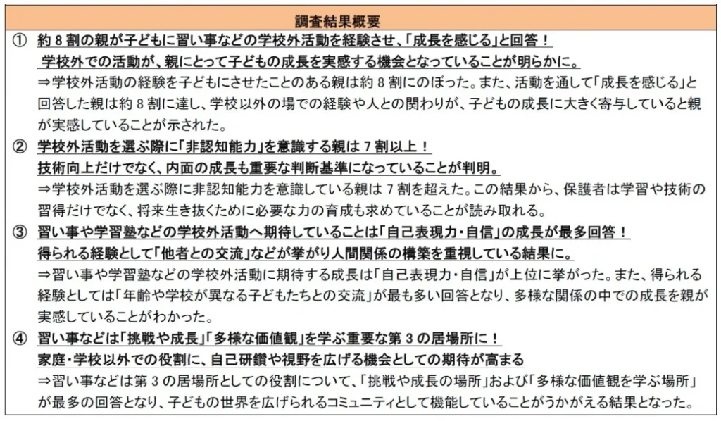 株式会社イー・ラーニング研究所が実施した「習い事・学習塾に関する意識調査」によると、8割以上の親が子どもの習い事や学習塾の経験が成長につながったと実感しています。特に「非認知能力」の育成や、家庭や学校以外の「第3の居場所」としての役割に期待が高まっていることが明らかになりました。 -