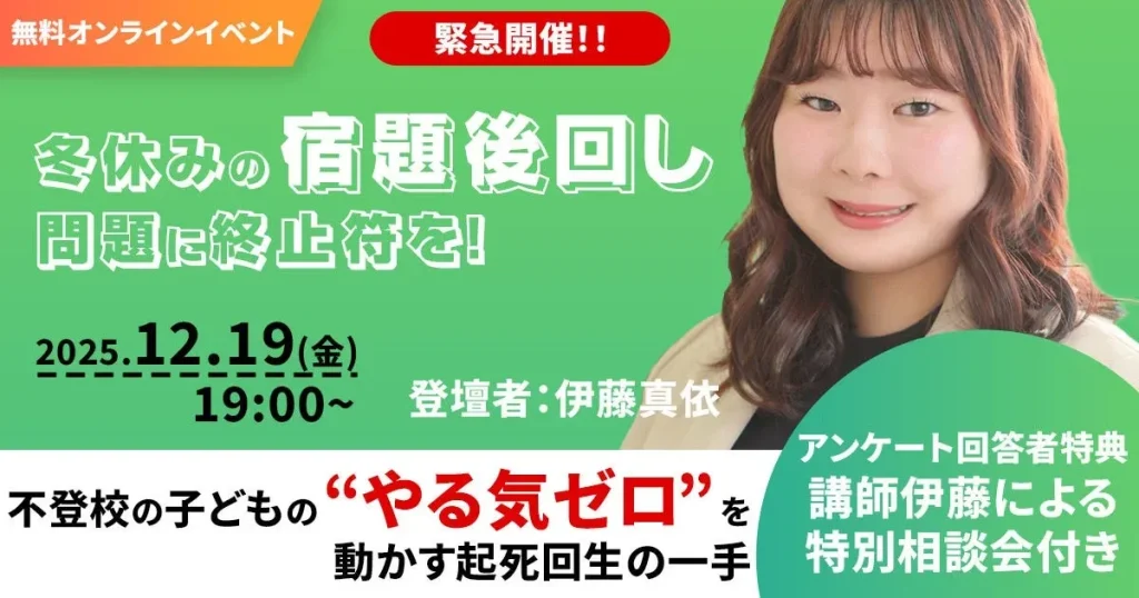 冬休みが近づき、不登校のお子さんの宿題の進捗に不安を感じている保護者の方も多いのではないでしょうか。キズキ共育塾が開催する無料オンラインイベントでは、不登校サポートのエキスパートが、お子さんの「やる気ゼロ」を動かす具体的な方法を解説します。親子の関係性を大切にしながら、冬休みの課題を乗り越えるためのヒントが見つかるかもしれません。 -