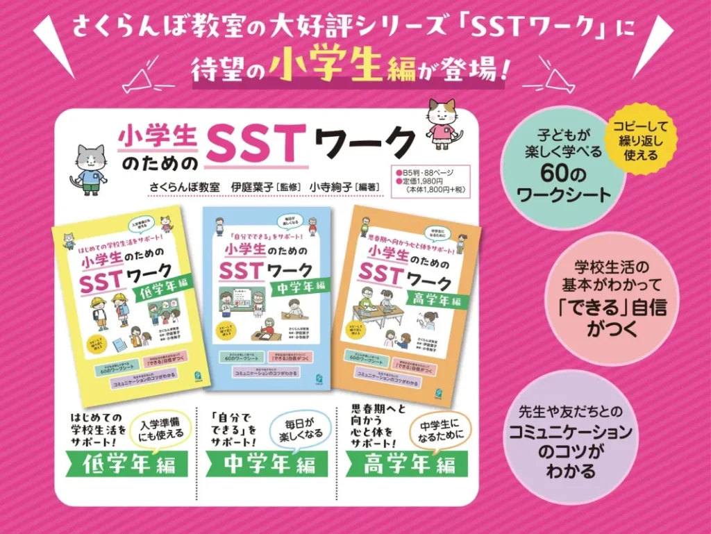 学事出版株式会社は、特別支援教育の「さくらんぼ教室」が監修する『小学生のためのSSTワーク』シリーズから、中学年編と高学年編を同時刊行しました。これにより、小学校1年生から6年生までの子どもたちが、学校生活や社会生活で必要なスキルを楽しく学び、自信を持って過ごせるようになります。 -