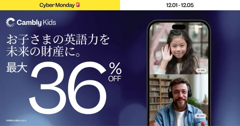 お子さんの英語学習を考えているお父さん、お母さんへ。オンライン英会話「Cambly Kids」が、2025年最後の年間最大割引となるCyber Mondayセールを実施します。楽しく英語を学べるレッスンが最大36%オフになるこの機会について、小学生3人の父である編集責任者が詳しく解説します。 -
