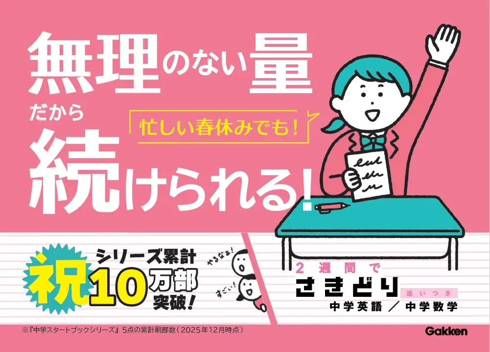 学研から発売されている、中学入学前の学習をサポートする『中学スタートブック』シリーズが、累計発行部数10万部を突破しました。春休み期間の先取り学習や、つまずきやすい内容の復習にぴったりの参考書です。 -