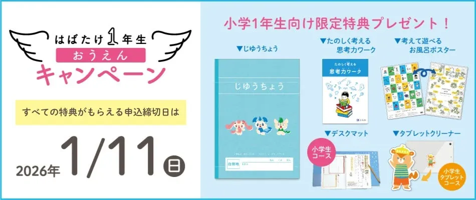 現在、早期申し込みの方を対象とした「はばたけ1年生おうえんキャンペーン」が実施中です。2026年1月11日(日)までにお申し込みいただくと、すべての特典を受け取ることができます。