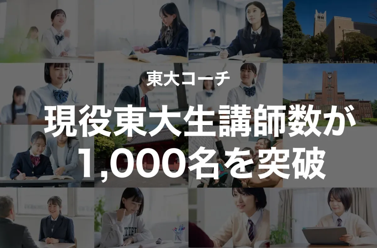 • オンライン家庭教師「東大コーチ」に在籍する現役東京大学の学部生・大学院生講師が、1,000名を超えました。