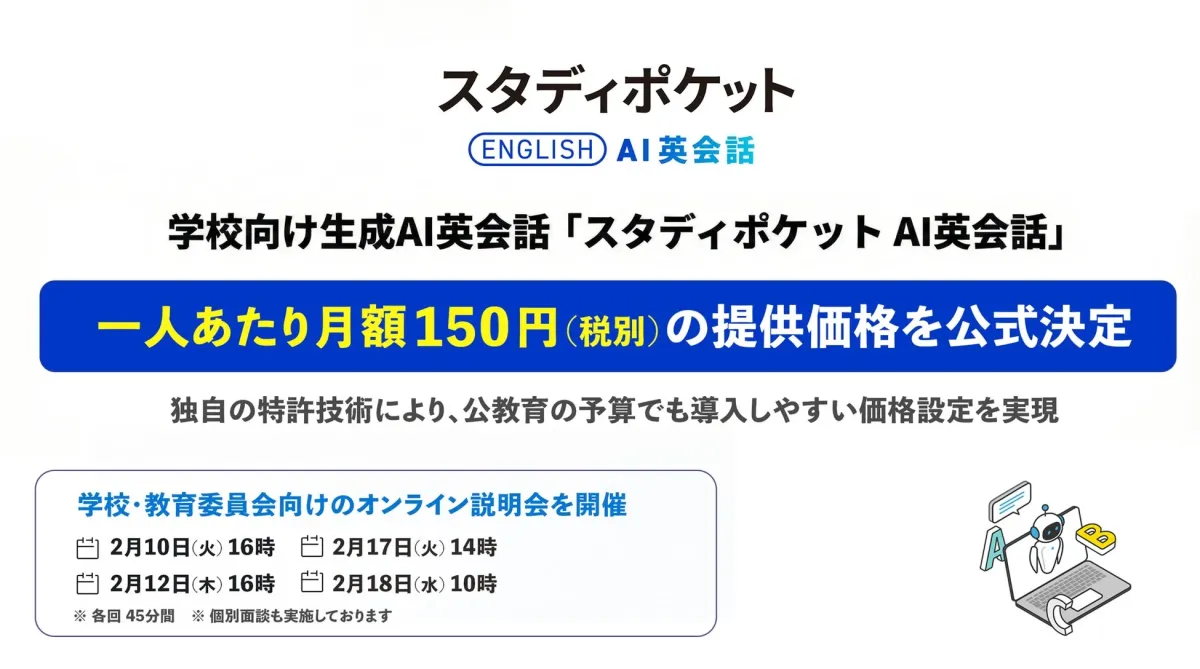 スタディポケット株式会社は、学校や教育委員会向けにオンライン説明会を2026年2月に計4回開催するとのことです。基本機能の紹介やデモンストレーション、新機能や導入方法について詳しく説明されるそうです。