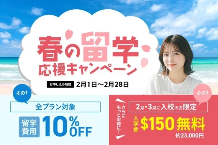 このキャンペーンは、3月から5月の春の留学シーズンにセブ島への渡航を考えているご家庭を応援するものです。2月中に申し込むと、留学費用が10%割引になり、さらに入学金も免除されるという、家計にも優しい特典が用意されています。