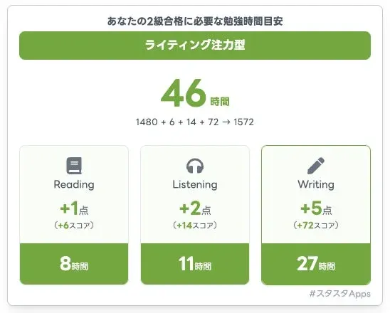 必要な勉強時間を算出:合計でどれくらいの勉強時間が必要か、さらにリーディング、リスニング、ライティングといった技能別に、どれくらい時間をかけるべきかの目安を教えてくれます。